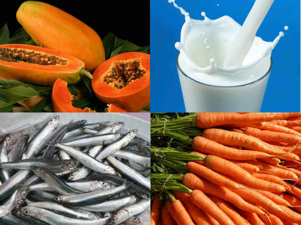 బొప్పాయి: బొప్పాయి పండులోవున్నన్ని విటమిన్లు మరెందులోను లేవంటారు వైద్యులు. ఈ పండును ఆహారంగా తీసుకుంటే ఆరోగ్యం చాలా బాగుంటుందంటున్నారు ఆరోగ్య నిపుణులు. ఇందులో విటమిన్ "ఏ", విటమిన్ "బీ", విటమిన్ "సీ", విటమిన్ "డీ"లు తగుమోతాదులోనున్నాయి. తరచూ బొప్పాయిపండును ఆహారంగా తీసుకుంటుంటే శరీరానికి కావలసిన విటమిన్లు పుష్కలంగా లభిస్తాయి. కెరోటిన్, ఎ, బి, సి, ఇ విటమిన్లు, ఖనిజాలు, ఫ్లేవొనాయిడ్లు, ఫొలేట్లు, పాంతోనిక్ ఆమ్లాలు, పీచు.వంటి పోషకాలు బొప్పాయిపండులో పుష్కలం కంటికి సంబంధించిన రోగాలు రాకుండా ఈ పండులోని బిటాకెరోటిన్ (2020 ఐ.యూ.) తోడ్పడుతుంది.