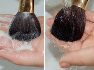 బ్రష్ లను శుభ్రపరిచే ముందు చాలా సున్నితంగా శుభ్రపరచాలి. రష్ గా ఎలా పడితే అలా రుద్దకూడదు. అలే చేస్తే బ్రిలిల్స్ రాలిపోతాయి. బ్రష్ లను శుభ్రపరచడానికి బేబి షాంపూ లేదా ఏదైనా ఫేష్ వాష్ క్రీం వేసి సున్నితంగా కడగాలి. తర్వాత శుభ్రమైన, మెత్తటి పొడి వస్త్రం ఉపయోగించి బ్రష్ లో ఉండే నీటిని పిండివేయాలి. పొడి టవల్ మీద ఆ బ్రెష్ ను అలాగే పొడి వాతారణంలో ఆరనివ్వాలి. కొన్ని(ఐ షాడో, కన్సీలర్స్) బ్రష్ లు అతి త్వరగా ఆరిపోతాయి. మరికొన్ని(బుకీ)బ్రష్ లు ఆరడానికి ఎక్కువ సమయం తీసుకొంటాయి. అది గమనించాలి.