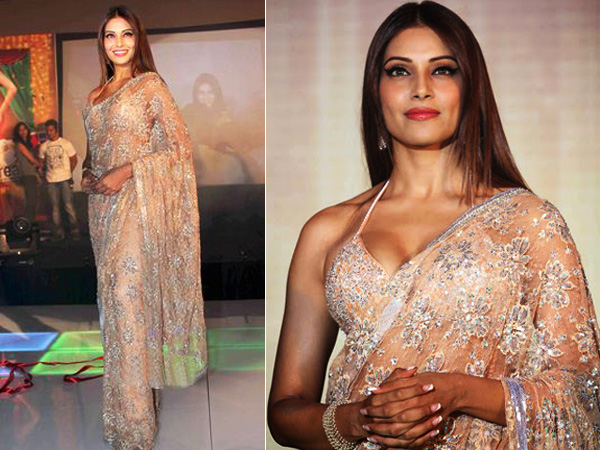 వెండితో ఉన్న న్యూడ్ రంగు చీరలో బిపాషా ఒక దేవదూతలాగా కనపడుతుంది. నేపథ్యవర్ణంలో కనపడే పూల రంగు ఈ చీరకు ఒక అందమైన ప్రభావాన్ని పెంచుతుంది. అంతేకాక, ఆమె చీరతో పాటు ధరించిన చోళి బహిర్గతం అవుతూ ఉంటుంది మరియు అందంగా ఉంటుంది.