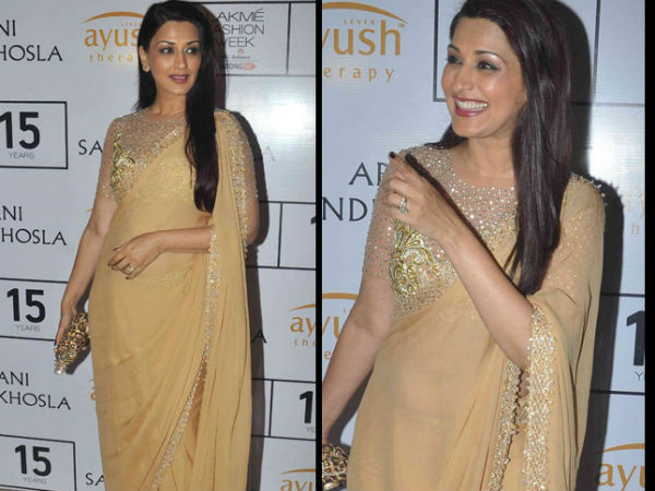 సోనాలీ బింద్రే లైట్ బ్రౌన్ శారీలో లాక్మే ఫ్యాషన్ వీక్ కర్టెన్ రైజర్ ప్రారంభోత్సవంలో చాలా అద్భుతంగా బ్రీత్ టేకింగ్ గా కనబడుతున్నది. అబు మరియు సందీప్ జంటగా డిజైన్ చేసి ఈ శారీ ఎంబ్రాయిడరీ మరియు మెష్ బ్లౌజ్ చాలా క్యూట్ అండ్ బ్యూటిఫుల్ గా కనబడుతున్నది.