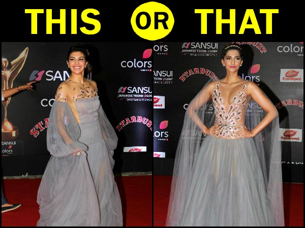 ఇద్దరు తారలు ఒకే రెడ్ కార్పెట్ ఈవెంట్ లో ఒకే బ్రాండ్ దుస్తులు వేసుకుంటే! ఇలాంటిదే ఇటీవలి స్టార్ డస్ట్ అవార్డ్స్ లో జరిగింది. సోనం లేక జాక్వేలిన్, మీకు నచ్చిన వారిని ఎంచుకోండి!
