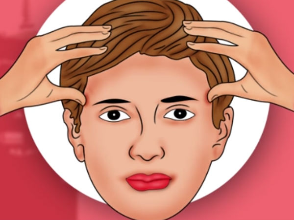మీ కణతలపై మృదువుగా ఒత్తిడిని పెట్టి, దీర్ఘశ్వాస తీసుకుంటూ, బ్రొటనవేళ్లను వలయాకారంలో కదలిస్తూ, 5 నుండి 10 నిమిషాల పాటు మర్దన చేయండి.