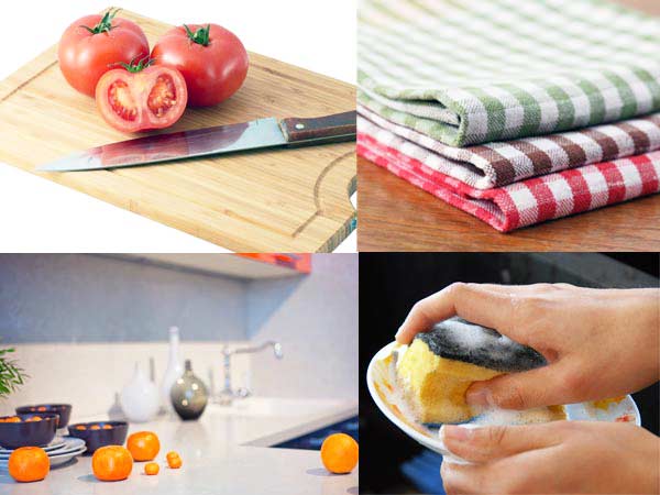 కట్టింగ్/చోపింగ్ బోర్డ్: సాధారణంగా ప్రతి రోజూ వెజిటేబుల్స్ ను కట్ చేసే కట్టింగ్ బోర్స్, తప్పనిసరిగా బ్యాక్టీరియా చేరుతుంది. పనిపూర్తైయన వెంటనే సాధారణ నీటితో డిటర్జెంట్ పెట్టి శుభ్రం చేస్తే సరిపోదు. క్రిములు కటింగ్ బోర్డ్ మద్యలోనే కాదు, బోర్డ్ హాండ్స్ దగ్గర, మరియు బోర్డు చూట్టు, ఏదైనా ఫోల్డ్ అయిన ప్రదేశాల్లో కూడా చేరి బ్యాక్టీరియా ఏర్పడే అవకాశం ఉంది. టమోటో, పచ్చిమిర్చి వంటివి కట్ చేసినప్పుడు అందులోని గింజలు అంత సులభంగా పోవు, దాంతో బ్యాక్టీరి ఫామ్ అవుతుంది. కాబట్టి కటింగ్ బోర్డ్ ను బాగా శుభ్రం చేయకపోతే బ్యాక్టీరియా ఏర్పడి ఇన్ఫెక్షన్, ఫుడ్ పాయిజన్ అయ్యే ప్రమాదం ఉంది. అందుకు పని పూర్తి అయిన వెంటనే గోరు వెచ్చని నీటితో శుభ్రం చేయాలి. వెజిటేబుల్ కటింగ్ బోర్డ్, మాంసాహారం కటింగ్ బోర్డ్ ను వేరు వేరుగా శుభ్రం చేయడం వల్ల అనవసరమైన కాలుష్యాన్ని నివారిస్తుంది.