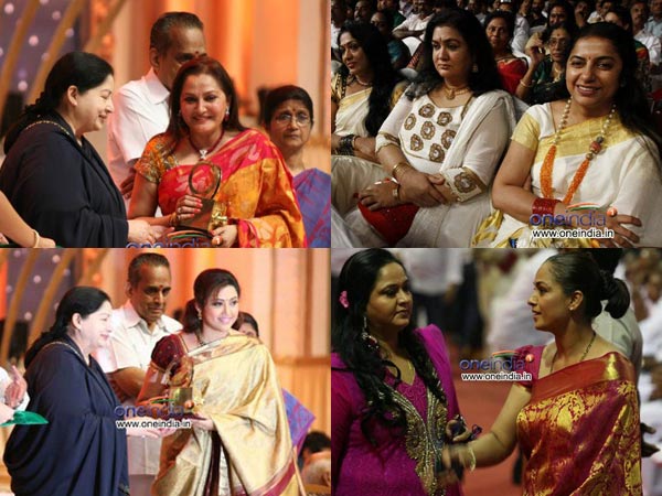 మీన ఒకప్పటి స్టార్ హీరోయిన్, మన ధక్షిణాది స్టార్ హీరోలతో నటించిన నటి భారతీయ సినిమా శత వసంతాల వేడుక హాజరై, తమిళనాడు ముఖ్యమంత్రి జయలలిత చేతుల మీదుగా అవార్డును అందుకొన్నారు. క్రీమ్ కలర్ గోల్డన్ కలర్ శారీ అద్భుతంగా ఉంది.