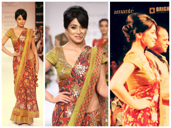 సౌంత్ ఇండియన్ యాక్టర్స్ అయిన శ్రియ, ఒక స్టన్నింగ్ ఫ్లవర్ డిజైన్ శారీతో ర్యాంప్ వాక్ చేసింది. డిజైనర్ శశికంఠ నాయుడు డిజైన్ చేసిన ప్రతి ఒక్క డిజైన్స్ సాధరణంగా డిఫరెంట్ గా ఉంటాయి . ఈ డిజైన్స్ లో వివిధ రకాల ప్యాట్రన్స్ కలిగి ఉన్నాయి. లాక్మే ఫ్యాషన్ వీక్ 2014 ర్యాంప్ వాక్ చేసిన శ్రియ కట్టిన శారీ రెడ్, బ్లూ, ఎల్లో మిక్స్డ్ కలర్స్ తో డిజైన్ చేయబడింది . అలాగే శారీ బార్డర్ మాస్ గ్రీన్ కలర్ మరియు కొంచెం ఆసక్తికరమైన గళ్లడిజైన్ తో డిజైన్ చేయబడింది . శారీమొత్తం ఒకే డిజైన్ తో ఫ్లవర్ డిజైన్ కలిగి ఉంది.