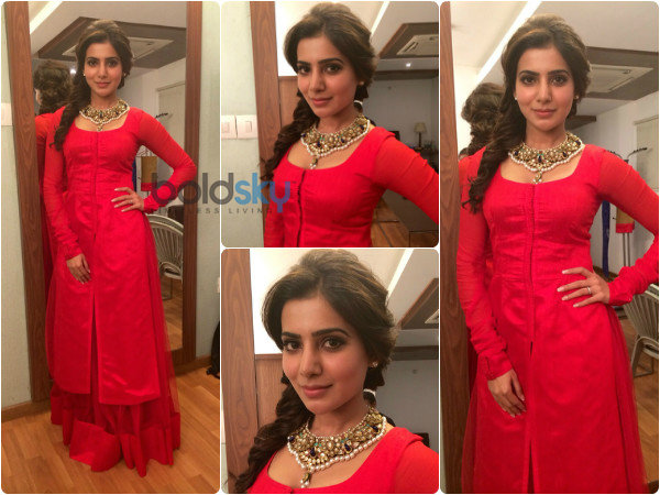 రెడ్ కార్పెట్ కోసం వేసుకోవల్సినటువంటి ఈ అందమైనటువంటి రెడ్ కలర్ గౌన్ బాటమ్ చాలా ఫ్రిల్స్ తోటి డిజైన్ చేయడం వల్ల చాలా భారీ లుక్ ను అందిస్తున్నది. అలాగే హై నెక్ లైన్ ప్యాట్రన్ కు ఫర్ఫెక్ట్ గా గోల్డ్ ప్లేటెడ్ నెక్ లెస్ అలకరించిన సమమంత మరో హైలైట్ గా కనబడుతున్నది. ఈ నెక్ లెస్ చిన్న ముత్యాలు, మరియు జెమ్ స్టోన్స్ , రాళ్ళతో రూపొందించడం వల్ల ఆమె అందానికి ఇది మరింత హైలెట్ గా అనిపించింది.