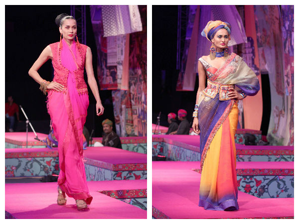 మోడల్స్ ధరించిన ఈ చీరలో ర్యాంప్ వాక్ చాలా బాగా ఆకట్టుకొన్నాయి . పింక్ నియాన్ కలర్ ఫర్ఫెక్ట్ గా అనిపించాయి.