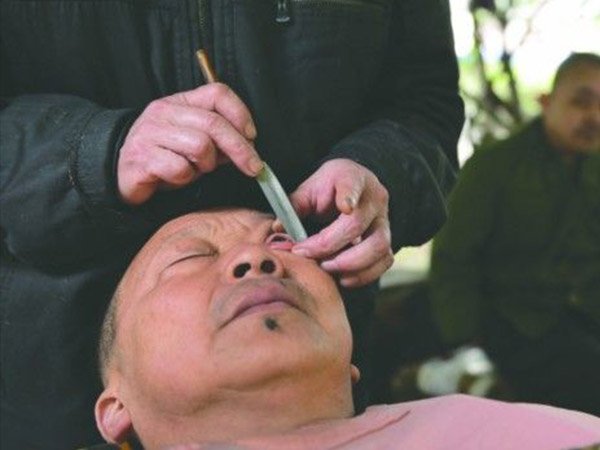 కనుగుడ్డను, కను రెప్పలను ఇలా కత్తితో శుభ్రం చేయించుకోవడం చైనాలో సనాతన ఆచారం. ఇలా చేసేటప్పుడు పదునైన వస్తువులను వాడతారట.
