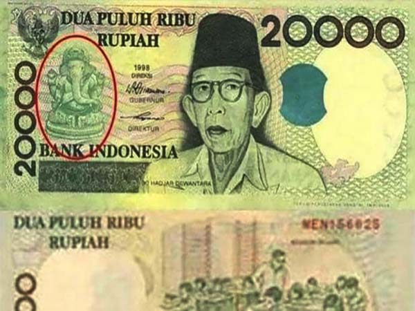 ఇండోనేషియా దేశంలోని 20 వేలు రూపాయలు విలువ చేసే కరెన్సీ నోటు రుపయా నోటులో ఆ దేశ స్వాతంత్య్ర సమరయోధుడు కి హజార్ దేవంతరా చిత్రానికి పక్కనే వినాయకుడి చిత్రాన్ని ముద్రించారు.