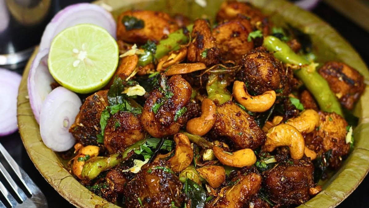 -తర్వాత స్టవ్ మీద మరో పాన్ పెట్టి అందులో 1 టేబుల్ స్పూన్ నెయ్యి వేసి వేడి చేశాక ఇందులో కొన్ని జీడిపప్పులు వేసి లైట్ గా కలర్ మారేదాకా వేయించి ఈ జీడిపప్పులను నెయ్యితో సహా చికెన్ ముక్కల్లో వేసి కలపండి. సన్నగా తరిగిన కొత్తిమీర కూడా అందులో వేసి బాగా కలిసేటట్లు కలుపుకోండి.