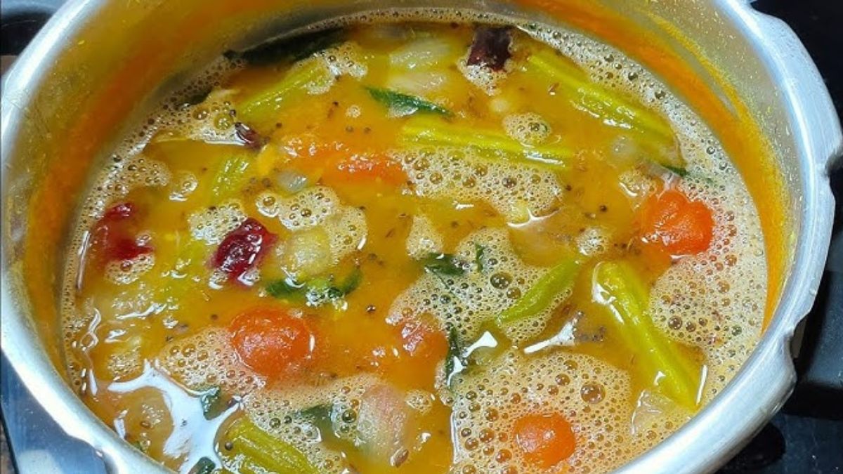 -కుక్కర్ ఆవిరి పోయాక మూత తీసి స్మాషర్ లేదా పప్పుగుత్తితో ఆ మిశ్రమాన్ని మెత్తగా మెదుపుకోవాలి. తర్వాత ఒక జల్లెడ తీసుకుని ఆ రసాన్ని ఒక గిన్నెలోకి వడకట్టుకోవాలి.