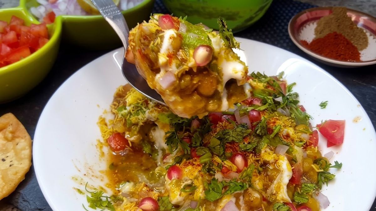 -పెరుగు పైన తీపి చింతపండు చట్నీని, అలాగే కారంగా ఉండే పచ్చి చట్నీని కొద్దికొద్దిగా వేయండి. ఆ తర్వాత సన్నగా తరిగిన ఉల్లిపాయ ముక్కలు, టమాటో ముక్కలను పైన చల్లండి.