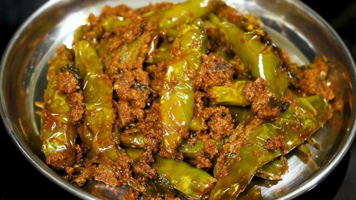 -తర్వాత పావు కేజీ లావాటి పచ్చిమిరపకాయలను శుభ్రంగా కడిగి పైన తొడిమలను తీసేసి గుడ్డతో తుడవాలి. తర్వాత వాటికి మధ్యలో నిలువుగా చీలికలు పెట్టాలి, కానీ అవి రెండుగా విరిగిపోకుండా జాగ్రత్తపడాలి.