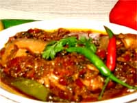 4. ఈ మిశ్రమానికి కొద్దిగా పసుపు, నిమ్మరసం వేసి పేస్ట్ చేయాలి. బజ్జిమిరపకాయ తీసుకొని మద్యస్థంగా కట్ట చేసి అందులో తయారు చేసుకొన్న పేస్ట్ సగబాగాన్ని కూరి ఉడుకుతున్న చికెన్ లో వేసి బాగా ఉడకబెట్టాలి. అంతే కారం కారం అచరి చికెన్ రెడీ.