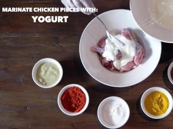 1.చికెన్ ముక్కలని ఒక గిన్నెలో తీసుకుని దానిలో పెరుగు, కారం, పసుపు, అల్లం వెల్లుల్లి పేస్ట్, ఉప్పు, గరం మసాలా వెయ్యాలి.