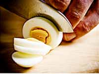 2. ఇప్పుడు ఉడికించిన గుడ్లను నిలువుగా సగానికి కోయాలి. పచ్చసొనను జాగ్రత్తగా తొలగించాలి. తొలగించిన పచ్చసొనను సాస్లో కలిపి బాగా గిలకొట్టాలి.