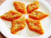 4. పంచదార పాకం దగ్గర పడే సమయంలో అందులో వేయించి పెట్టుకొన్న క్యారెట్, కొబ్బరి తురుము అందులో వేసి కొద్దిగా గట్టిపడ్డాక, ఆ మిశ్రమాన్ని తీసి మందపాటి వెడల్పైన ప్లేటుకు కొద్దిగా నెయ్యి రాసి అందులో వేసి దాని మీద కూడా డ్రైఫ్రూట్స్ చల్లి ఆరిన తర్వాత మనకు కావలసిన ఆకారంలో కట్ చేసి సర్వ్ చేయవచ్చు.