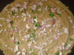 3. పెనం వేడిచేసి ఒక గరిటెడు పెసరట్టు పిండిని దోసెలా వేసి, దానిపై ఉల్లిమిశ్రమాన్ని పరచాలి. అట్ల కాడతో మూడు చెంచాల నూనె అట్టు మొత్తం కలిసేలా అదుముతూ, ఎర్రగా కాల్చాలి. అంతే పెసరట్టు రెడీ. దీనికి పల్లీల చట్నీ/అల్లం చట్నీతో సర్వ్ చేస్తే రుచిగా ఉంటాయి.