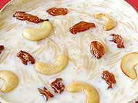 2. మరికొద్దిగా నెయ్యి వేడి చేసి సేమ్యాని కూడ బంగారు రంగు వచ్చేవరకు నిదానంగా వేయించి పక్కన పెట్టుకోవాలి. అందులోనే జీడిపప్పు, బాదాం, కిస్మిస్ వేయించి పక్కన పెట్టుకోవాలి.