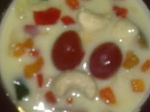 3. ఇప్పుడు కాచిన పాలు చల్లారాక ఫ్రిజ్ లో ఉంచి సర్వ్ చేసేప్పుడు సన్నగా కట్ చేసి పెట్టుకొన్నఅన్నిరకాల పళ్ళు అందులో కలపాలి. పళ్ళు వద్దు అనుకుంటే కాజూ, బాదం, ఖర్జూరాలు, కిస్మిస్ ఇలా డ్రైఫ్రూట్స్ అన్నీ కలపుకోవచ్చు. వీటితోపాటు చిట్టిచిట్టి గులాబ్ జామూన్స్ కానీ, రసగుల్లాలు కానీ వేసినా బావుంటుంది.