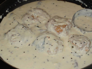 4. ఇప్పుడు స్టౌ వెలిగించి పాన్ పెట్టి నూనె వేడి చెయ్యాలి. నూనె కాగిన తరువాత రుబ్బిన పిండిని గారెలు లాగా ఒత్తి నూనెలో వేసి దోరగా వేయించి తీసి, పోపువేసిన పెరుగులో వేసి అరగంట పాటు పక్కన పెట్టాలి.