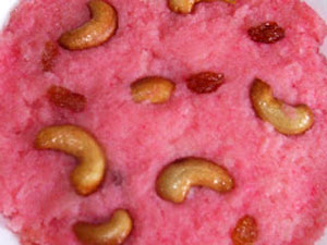 3. అప్పుడు అది హల్వాలా తయారవుతుంది. చిన్నకప్పులో కొద్దిగా నీరు పోసి అందులో ఫుడ్ కలర్ వేసి కరిగించి దానిని హల్వాలో వేసి కలపాలి. ఆ మిశ్రమాన్ని నెయ్యి రాసిన పళ్లెంలో పోసి జీడిపప్పు, ద్రాక్షలతో గార్నిష్ చేయాలి. అంతే పండుగ ఫలహారం రెడీ..