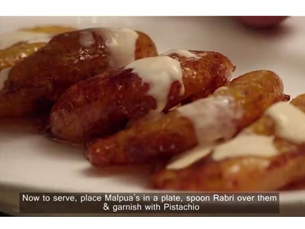 4.కొంచం రబ్రీ స్వీటు, కుంకుమ రేకులు,బాదాం పప్పులని మాల్ పువా మీద వేసి సర్వ్ చెయ్యాలి.