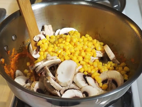 ఈ వంటకు కార్న్ జోడించడంవల్ల ఇందులో విటమిన్ డి మరియు ఎ పుష్కలంగా ఉండి మనశరీరానికి అందిస్తుంది. అలాగే మష్రుమ్స్ కూడా, ఇందులో డైటరీ ఫైబర్ పుష్కలంగా ఉంటుంది.