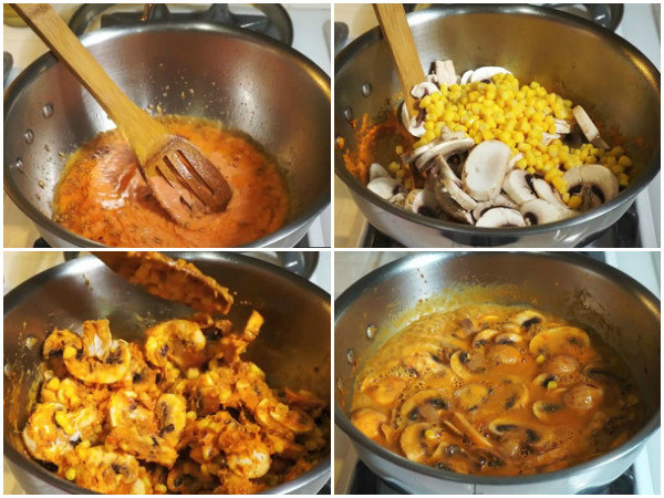 5. ఇలా మొత్తం మసాలా వేగించుకొన్న తర్వాత అందులో కార్న్ మరియు మష్రుమ్ వేసి మొత్తం మిశ్రామన్ని కలగలిపి సరిపడా నీళ్ళు పోసి ఉడికించుకోవాలి. గ్రేవీ చిక్కబడే వరకూ ఉడికించి తర్వాత స్టౌ ఆఫ్ చేయాలి.