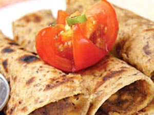 4. తరవాత గోధుమపిండిని ఉండలుగా చేసుకుని చపాతీలాగ ఒత్తి పెనం మీద వేసి నెయ్యితోకాని నూనెతో కాని కాల్చుకోవాలి. ఈ చపాతీలు టొమాటోసాస్ తో కాని, పుదీనా చట్నీతో కాని తింటే ఎంతో రుచిగా ఉంటాయి.