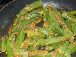4. తర్వాత పాన్ లో నూనె వేసి వేడయ్యాక మసాలా బేండీని వేసి వేయించాలి. చివరగా కొద్దిగా పసుపు ఉప్పు కలపాలి. అంతే బేండీ బరేలి రెడీ...